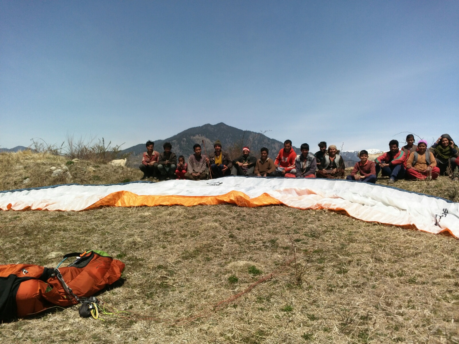 Around 5pm three is a nice valley wind, I saw a small hill with big flat empty space at the bottom, so I did several demonstrations flights (more like hops) in front of what seems to be the whole village, kids and adults are delighted. I learn that I'm the first foreigner that they meet, and they never saw paragliding either, so they're excited. The whole afternoon and evening I'm surrounded, no time or space for myself until bedtime. I'm exhausted.
