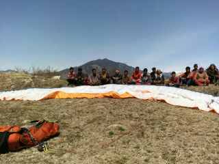 April 3. The face I'm on will take the valley wind, so I sleep a bit more and forget the hike. Many villagers are here to see me taking off, but the wind is strong and gusty, I need 3 tries to manage it. Not a good start, I'm in the air around noon.