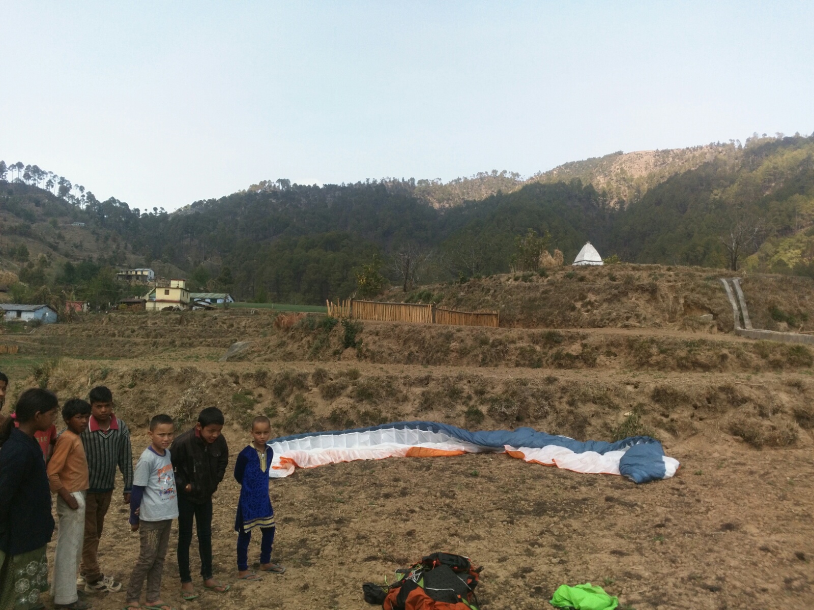 I chose to land in a big empty playing field at the bottom of the valley, because the cultures are planted almost everywhere. I got cheered by a lot of kids as I was doing wing overs to go down, I think they liked it as much as I did :-)