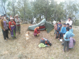 The hike is pleasant enough, but as the big clouds start to darken I start to look for a place to put my tent, not too close from the small houses that dot the mountain. As soon as I'm done with the tent I'm surrounded, again it's the first time that a foreigner comes here so I'm the local attraction of the day.