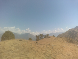 Finally when I start the hike they don't follow me, I guess they don't want to see me flying then! At first it's more climbing than hiking in the small wheat paddies, but it gets better. 2 hours later I'm at 2100m, at the top of a huge grass slope perfectly oriented. The Big Mountains to the North have been manufacturing cumulus since 9:30, the sky is blue, not a cirrus to spoil the day.